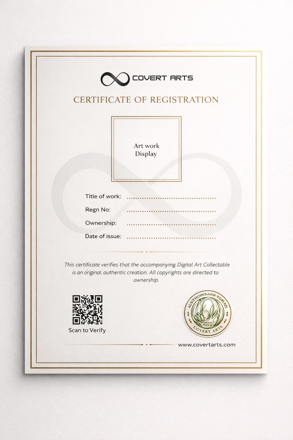 The Covert Arts Registration Certificate ensures that every artwork carries these values forward quietly, securely, and beautifully.